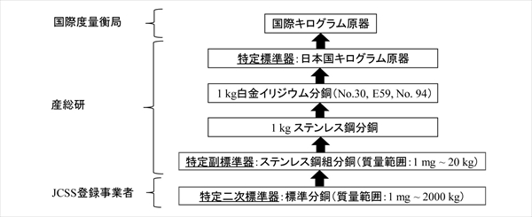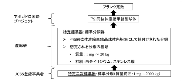 各分銅の質量は、シリコン単結晶球体の質量を基準にして校正されており、多数の標準分銅を群管理することによって質量の基準を保持することになる。