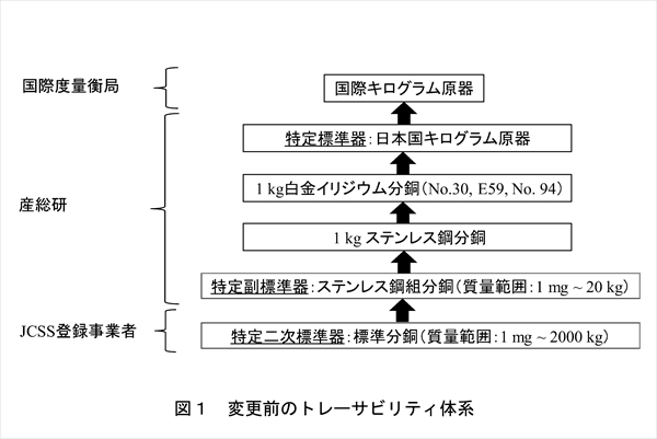 質量が1kgのキログラム原器が特定標準器であった変更前のトレーサビリティ体系では、分銅の質量が1kgから離れるほど不確かさが増すため、その質量を高精度に値づけすることが困難だった。